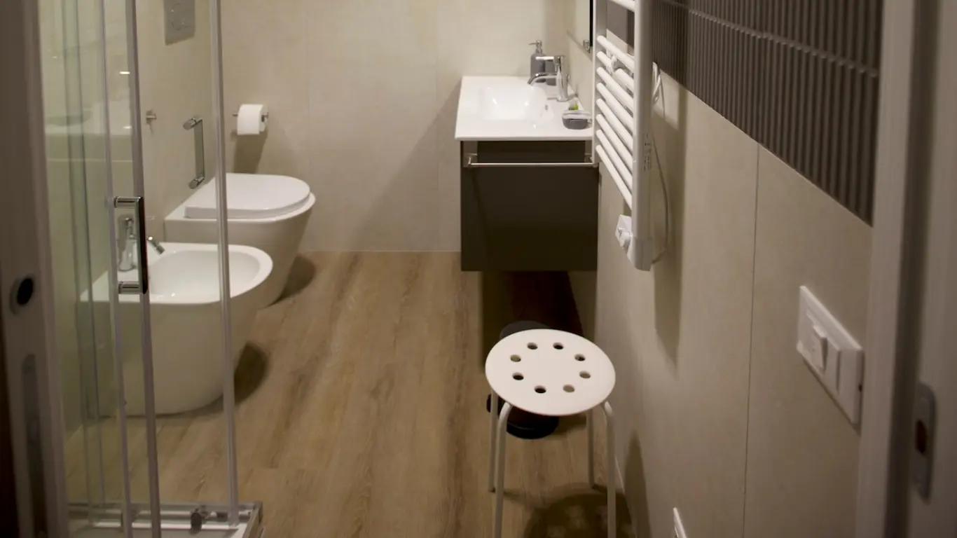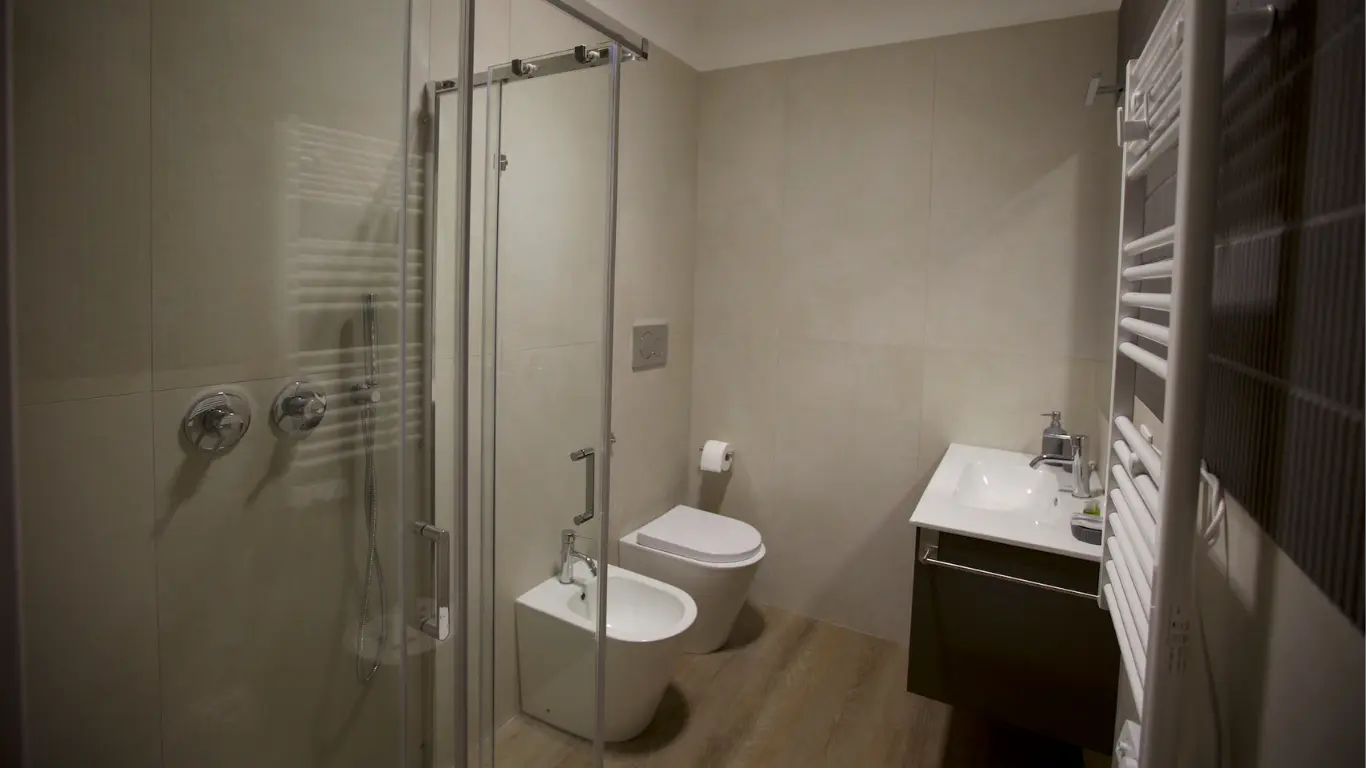 Il bagno in camera, curato nei dettagli e dotato di una confortevole doccia, completa l’esperienza con un tocco di piacevole intimità.